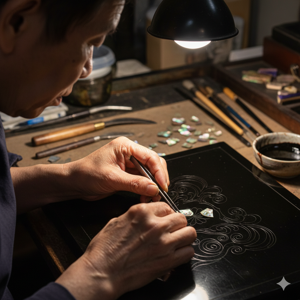 나무에 옻칠을 수십 번 반복한 후, 그 위에 얇게 자른 자개를 붙여 문양을 만듭니다. 고려시대부터 천 년 이상 이어진 기술입니다.