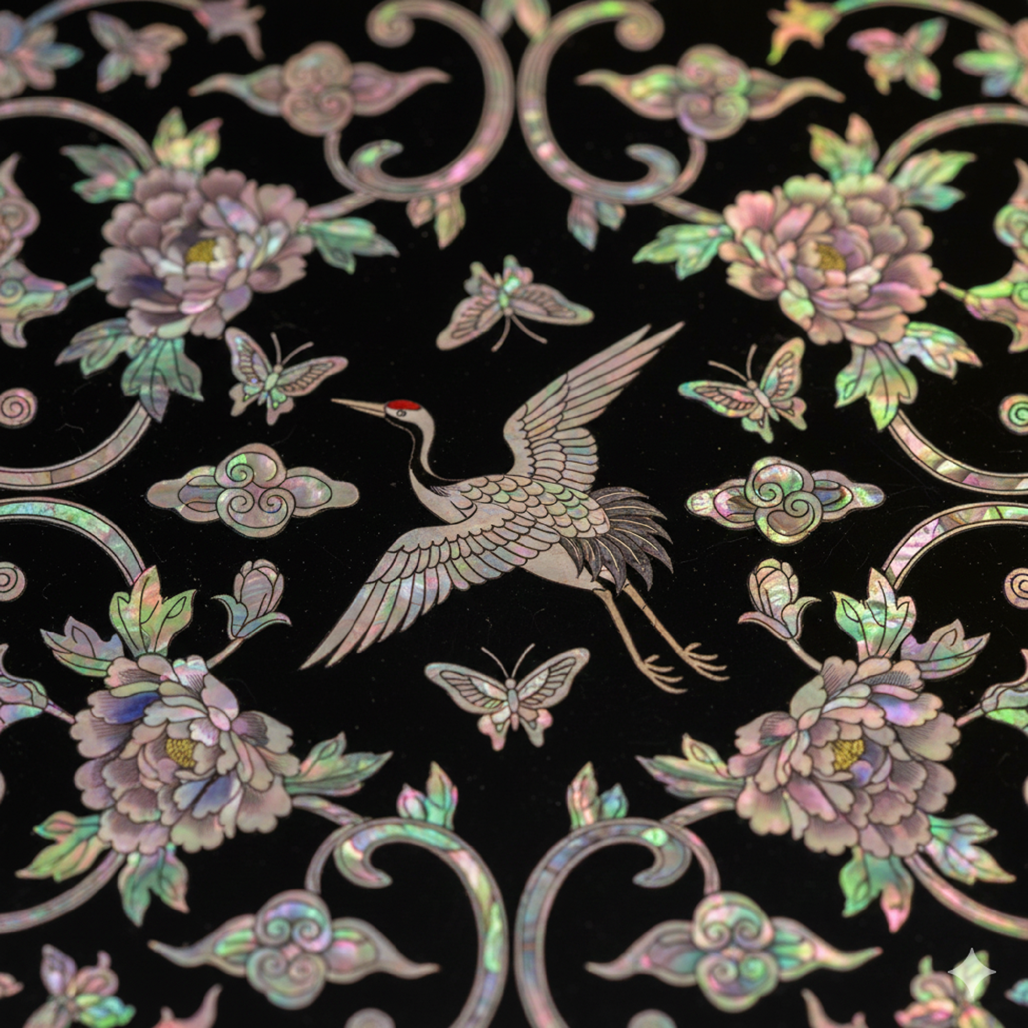 어둠 속에서 빛납니다. 자개 하나하나가 각도에 따라 다른 색을 냅니다. 보라, 초록, 분홍, 파랑. 무지갯빛이 살아 움직입니다.