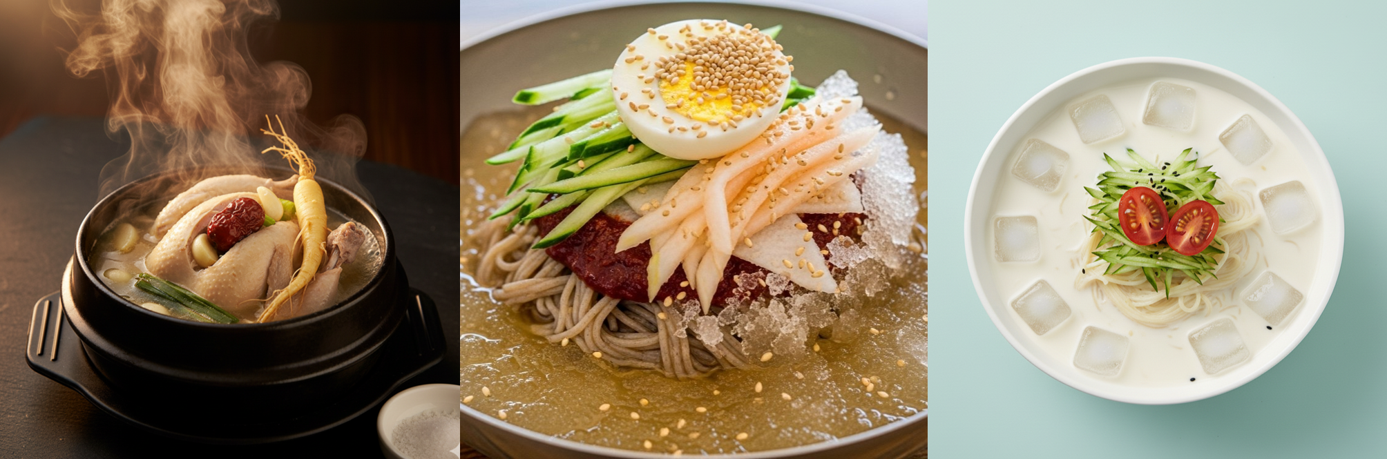 여름 음식은 극단을 오갑니다. 뜨거움의 극단(삼계탕)과 차가움의 극단(냉면). 하지만 목적은 같습니다. 균형을 찾는 것입니다.