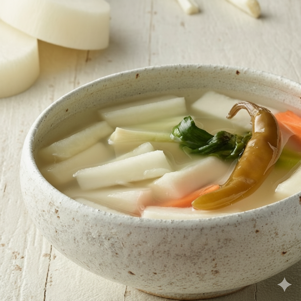 조리: 무를 큼직하게 썰어 소금물에 담급니다. 배, 생강, 파를 넣고 실온에서 2일, 냉장고에서 3일 숙성합니다.