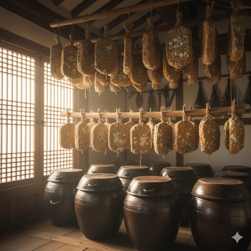 메주 표면의 흰 곰팡이, 이것이 핵심입니다. Aspergillus oryzae(황국균)라는 곰팡이가 콩의 단백질을 분해합니다. 이 과정에서 아미노산이 만들어지고, 감칠맛이 생깁니다.